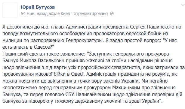 "Я дозвонился к и.о. главы Администрации президента Сергею Пашинскому по поводу возмутительного освобождения провокаторов одесской бойни из милиции по распоряжению прокуратуры. Я задал простой вопрос: "У нас есть власть в Одессе?". Пашинский сделал такое заявление: "Заместитель генерального прокурора Банчук Николай Васильевич принял чудовищное по своим последствиям решение об освобождении из-под стражи всех пророссийских сепаратистов, которых задержали за провоцирование массовой драки в Одессе. Администрация президента не понимает, как можно объяснить это освобождение с точки зрения законов Украины. Мы будем немедленно ходатайствовать перед генеральным прокурором Махницким об увольнении Банчука, и перед председателем СБУ Наливайченко относительно осуществления проверки действий Банчука по подозрению в тяжком государственном преступлении и измене Украине".