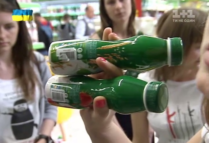 Как говорится в сюжете программы Гроші, на бутылке йогурта есть украинских штрих-код, но если присмотреться, то можно увидеть, что под ним есть русский штрих-код.