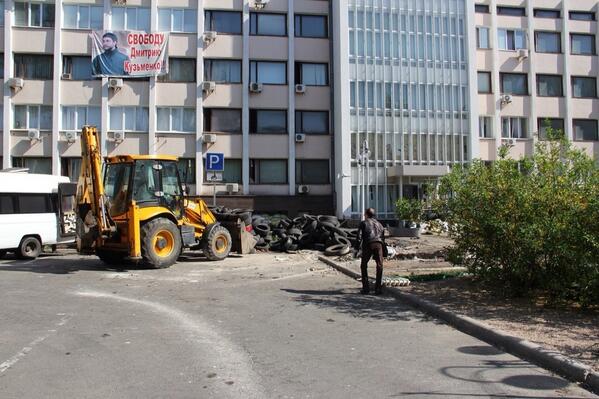 Сейчас возле горсовета Мариуполя работает техника. Люди в рабочей одежде разбирают баррикады, грузят шины на грузовые автомобили. С двух сторон горсовета работают экскаваторы.
