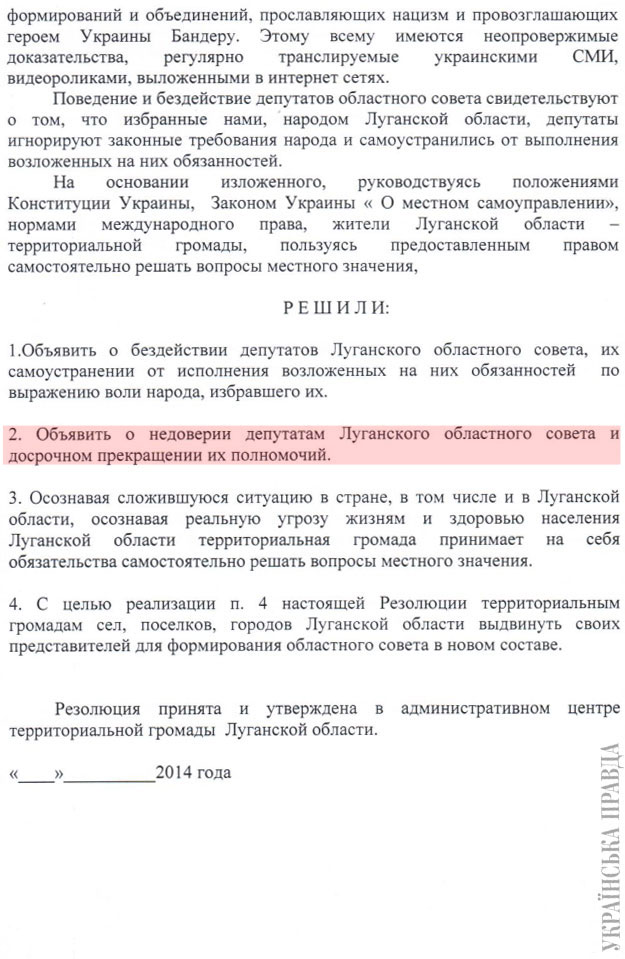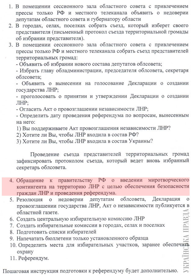 Ключевым этапом перехваченного сценария является объявление вне закона Луганского областного совета, на месте которого сепаратисты должны сформировать свой "орган", который и будет штамповать акты о независимости.