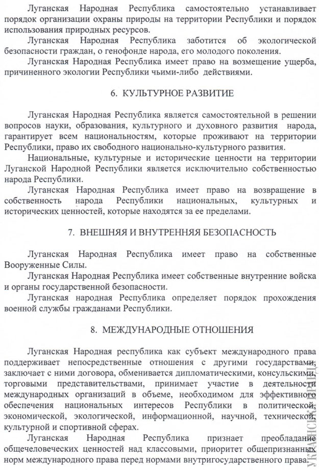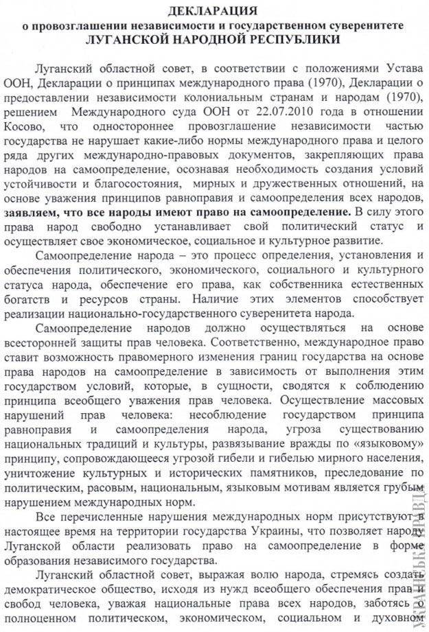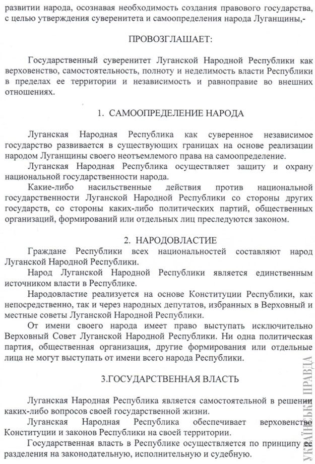 Тут же отмечается, что попытки центральной киевской власти они рассматривают как антизаконные. "Какие-либо насильственные действия против национальной государственности Луганской Народной Республики со стороны других государств, со стороны каких-либо политических партий, общественных организаций, формирований или отдельных лиц преследуются законом".