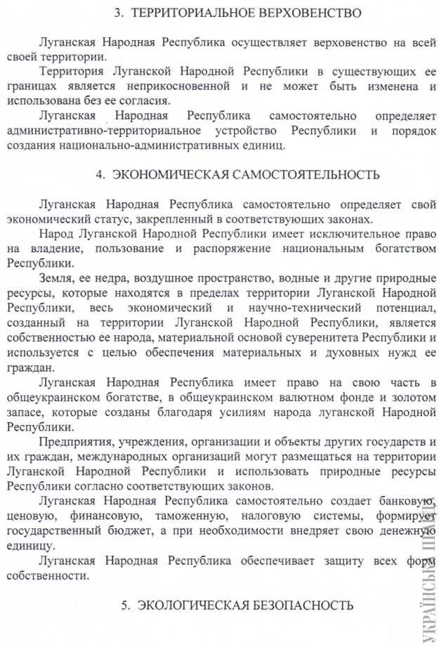 Также в "декларации о суверенитете" сепаратисты объявляют о том, что отныне только "народ Луганской Народной Республики имеет исключительное право на владение, пользование и распоряжение национальным богатством Республики".
