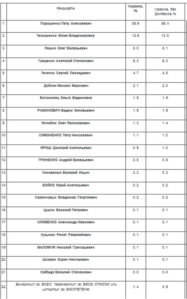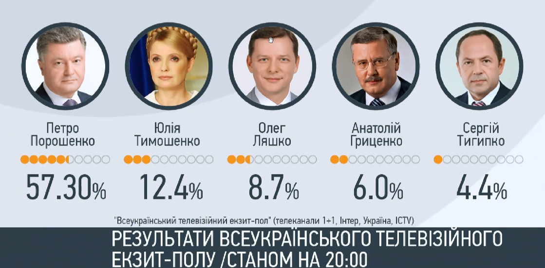 Согласно данным Национального экзит-пола в первом туре победу получает Петро Порошенко, который набирает 55% голосов избирателей.