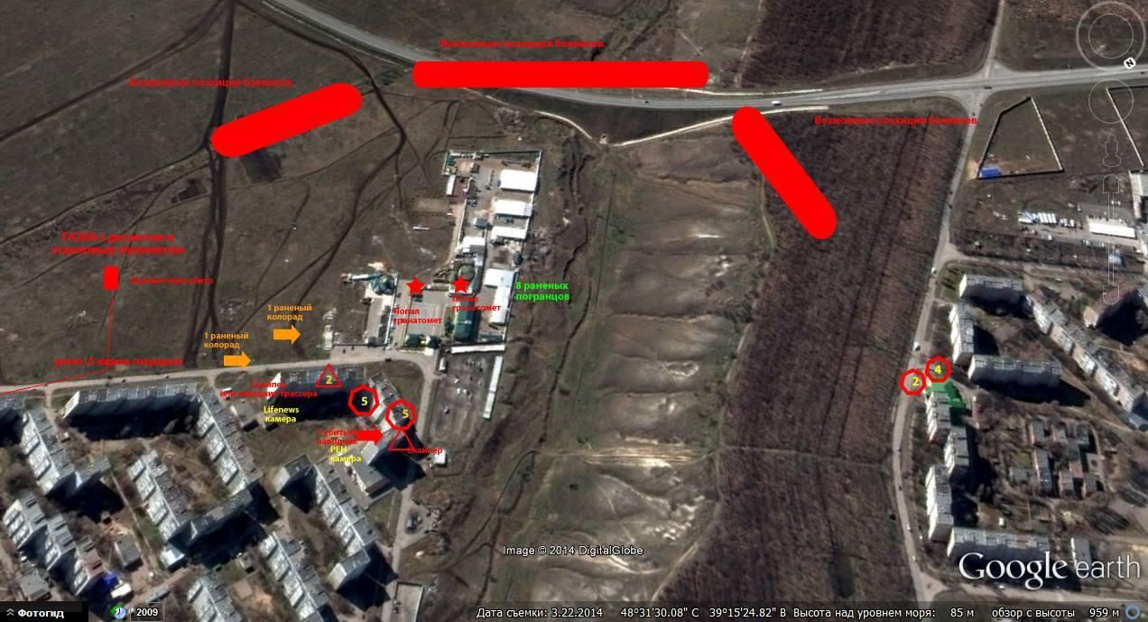 В шестигранниках указано количество боевиков, которые видны в кадрах. Также обозначено, где размещены корреспонденты Лайфньюс и РЕН. Обозначены два гранатометные попадания, и загоревшийся склад. Красные овалы - это вероятные позиции боевиков. На карте указаны позиции по состоянию на 11 часов утра.