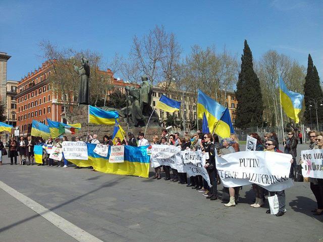 По сообщению, с национальной символикой и антипутинскими плакатами украинцы Рима рассказывали итальянцам о том, что происходит в Украине, опровергали "мифы российской пропаганды".
