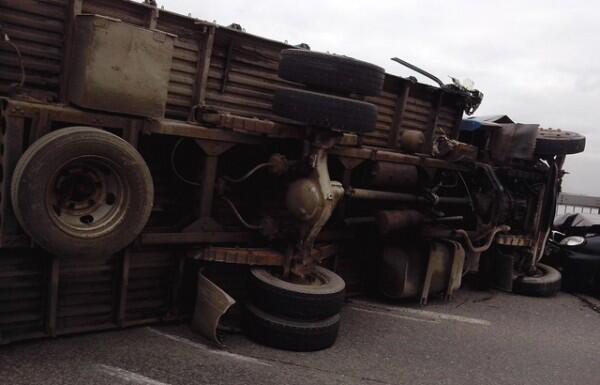 Как сообщает Gorlovka.ua, сейчас к месту аварии - возле автозаправочной станции - подъехал кран, пытается поднять грузовик, но пока безуспешно, передает УНН.