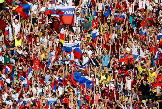 Российские болельщики нарушили правила ФИФА, вывесив на стадионе "Маракана" в Рио-де-Жанейро флаг террористов.
