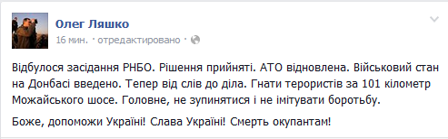 "Состоялось заседание СНБО. Решения приняты. АТО восстановлена. Военное положение на Донбассе введено. Боже, помоги Украине! Слава Украине!"- написал Ляшко в Facebook