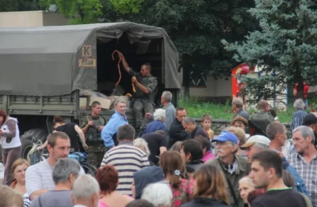 Украинские военные привезли гуманитарную помощь в Славянск и раздавали людям из грузовика сосиски. Когда в толпе появились двое мужчин, местные начали кричать, что это террористы, и требовали их поймать.