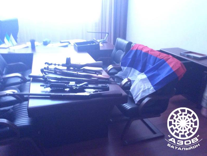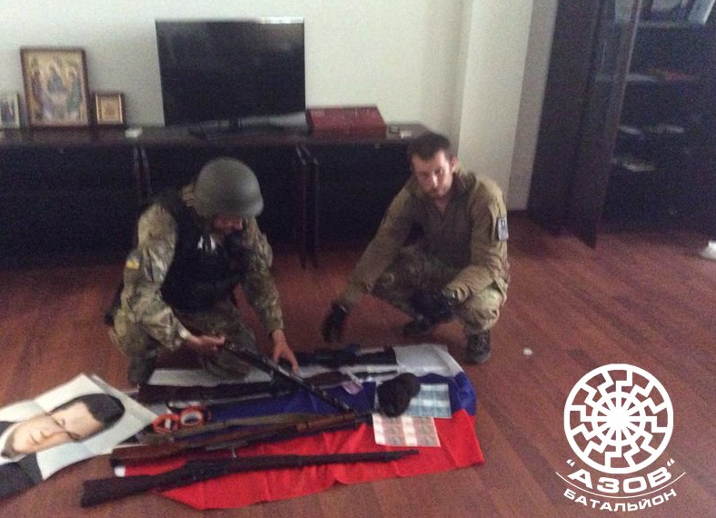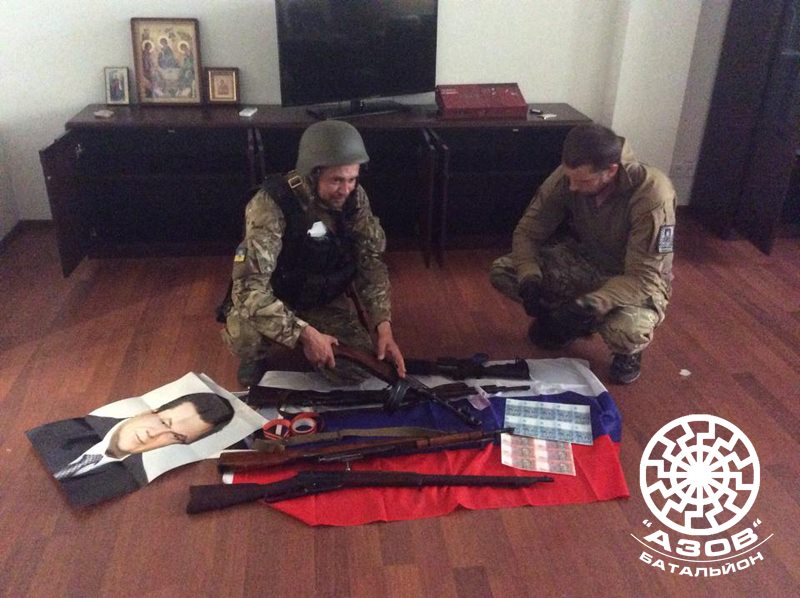 На территории Азовского рынка (Мариуполь — ред.), принадлежащего свахе экс-Президента Украины Виктора Януковича, бойцы спецбатальона «Азов» нашли арсенал оружия, колорадские ленты, флаги самопровозглашенной «Донецкой народной республики» и Российской Федерации. Помимо этого, были также обнаружены фальшивые гривневые купюры.