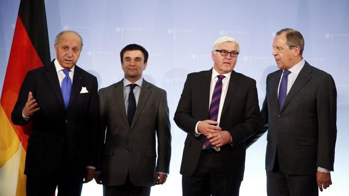 На виллу «Борзиг» в Берлине прибыли Павел Климкин (Украина), Сергей Лавров (Россия), Франк-Вальтер Штайнмайер (Германия) и Лоран Фабиус (Франция).