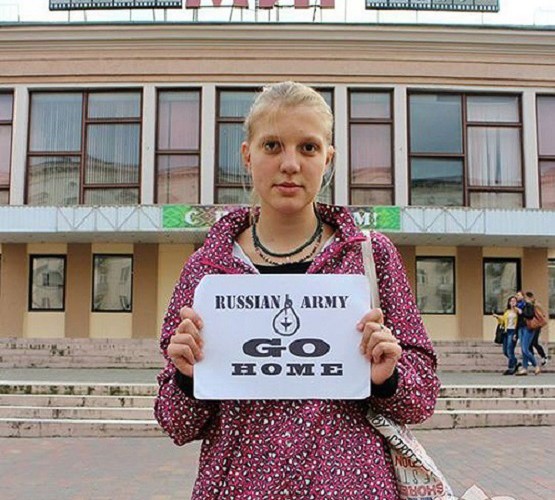 В частности, белорусские девушки из группы в Facebook Together for Belarus Разам для Беларусі сфотографировались с листовками «RUSSIAN ARMY GO HOME!».