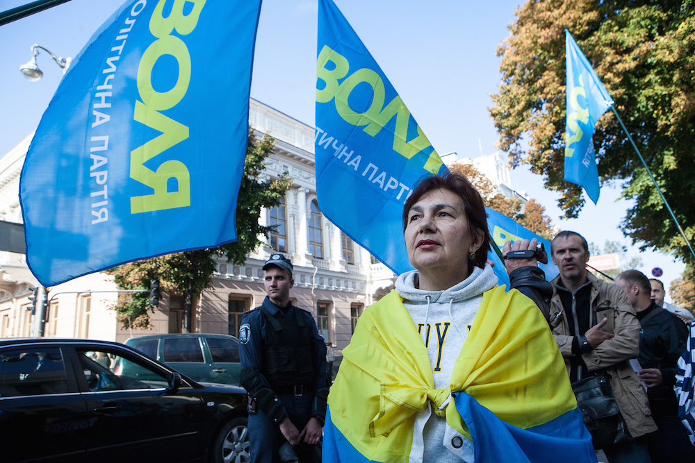 К участникам акции обратился народный депутат Украины, член Совета партии «ВОЛЯ», соавтор законопроекта «Об очистке власти» Юрий Деревянко, который сообщил, что по поручению председателя ВРУ сегодня, в перерыве работы парламента, должно состояться заседание комитета по вопросам государственного строительства и местного самоуправления под руководством Давида Жвании.