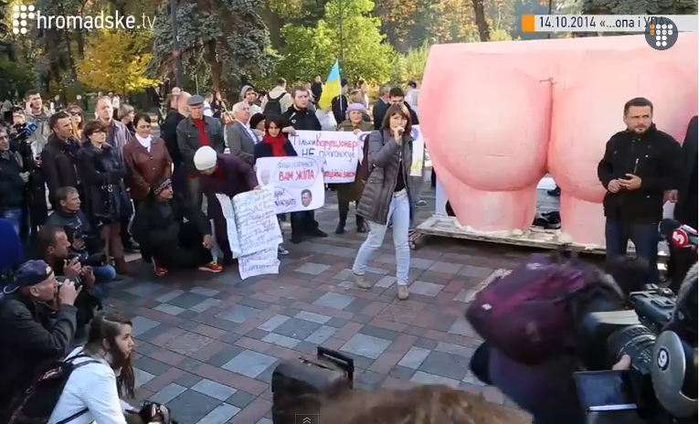Во время заседания Верховной Рады во вторник, 14 октября, представители «Центра противодействия коррупции» установили под зданием парламента «Коррупционную задницу».