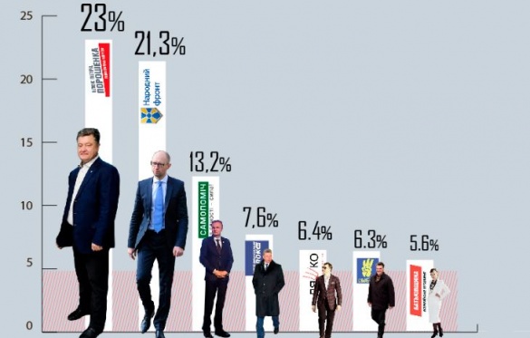 Согласно с ними, партия "Блок Петра Порошенко" набирает 23%, "Народный фронт" - 21,3% и "Самопоміч" с результатом в 13,2%.