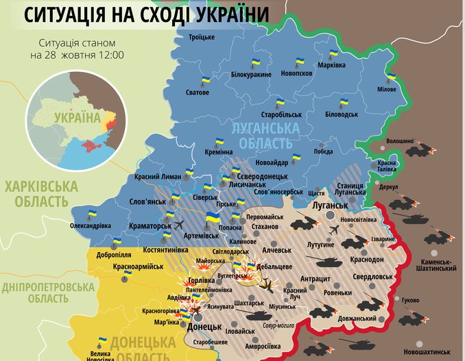 Информационно-аналитический центр СНБО опубликовал обновленную карту зоны проведения АТО по состоянию на полдень 28 октября.