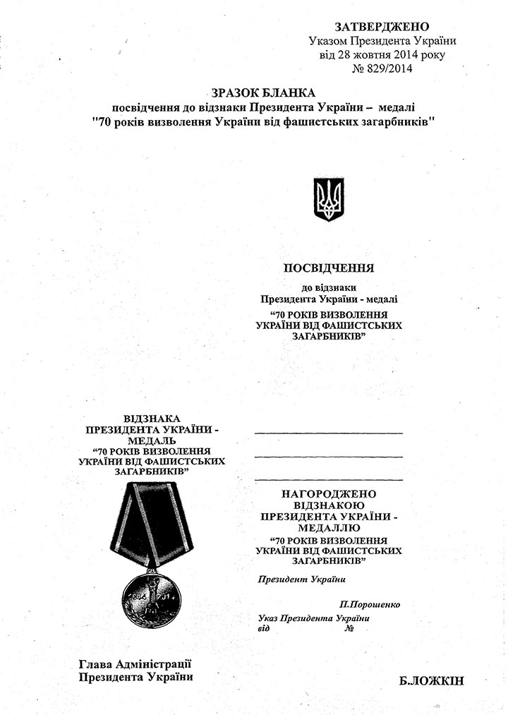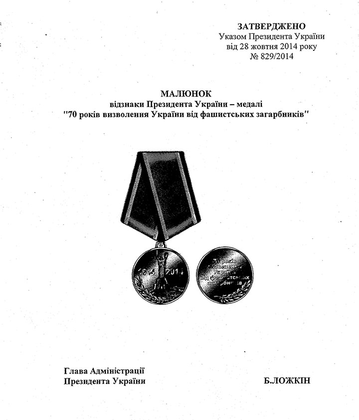 Глава государства Петр Порошенко подписал указ об установлении отличия Президента Украины - медали «70 лет освобождения Украины от фашистских захватчиков».