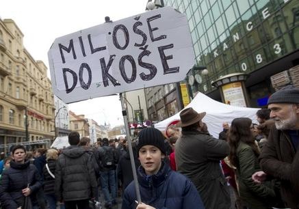 Демонстранты потребовали отставки главы государства, известного своим сквернословием и неоднозначной позицией по конфликту на востоке Украины. В руках многие из протестующих держали красные карточки – как символ, что Земану по аналогии с футболом пора "удалиться с поля". Кроме того, в толпе то и дело виднелись транспаранты со слоганами "Нам стыдно за нашего президента" и "Мы не хотим стать колонией России". Кроме того, впервые в 1989 года зазвучал лозунг "Miloše do koše" ("Милоша в мусорку"), которым во время "бархатной революции" требовали отставки тогдашнего генсека ЦК компартии Чехии Милоша Якеша.