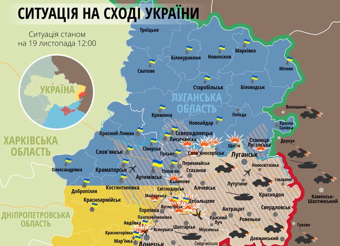 Информационно-аналитический центр Совета национальной безопасности Украины опубликовал актуальную карту зоны проведения АТО на востоке Украины по состоянию на полдень 19 ноября.
