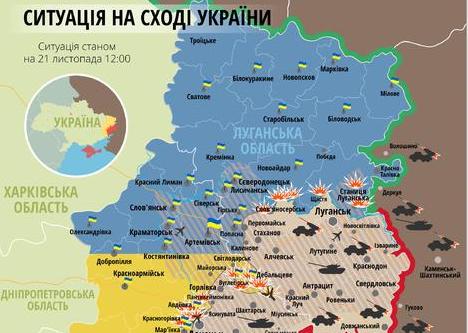 Информационно-аналитический центр Совета национальной безопасности Украины опубликовал актуальную карту зоны проведения АТО на востоке Украины по состоянию на полдень 21 ноября.