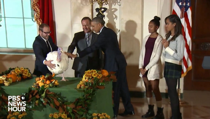 Выступление Обамы носило юмористический характер. По традиции глава государства торжественно помиловал двух индеек. В этом году официально амнистированы главой государства были птицы по имени Мак и Сыр.