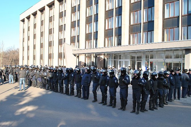 Депутаты заседают в сессионном зале Дзержинского райисполкома. Вокруг здания для охраны общественного порядка находится более 100 правоохранителей и бойцы спецбатальона "Кривбасс". В самом здании на трех этажах расположились ребята спортивного телосложения.
