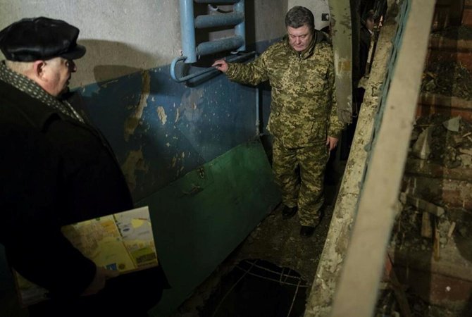 В частности, Порошенко посетил жилой дом по улице Сакко и Ванцетти. В это двухэтажное здание попал снаряд, который пробил крышу, разрушил лестничный марш и вошел в подвал.