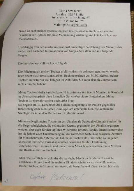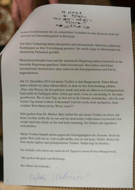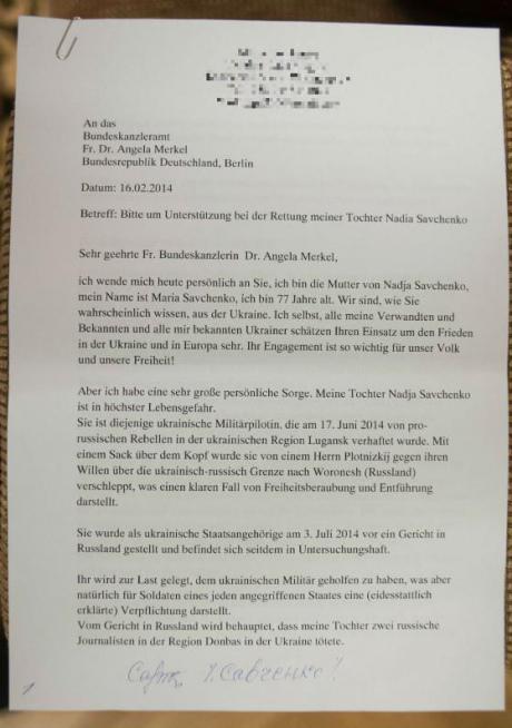 В письме мать Савченко просит Меркель помочь "спасти дочку", поскольку сама не в состоянии помочь ей.