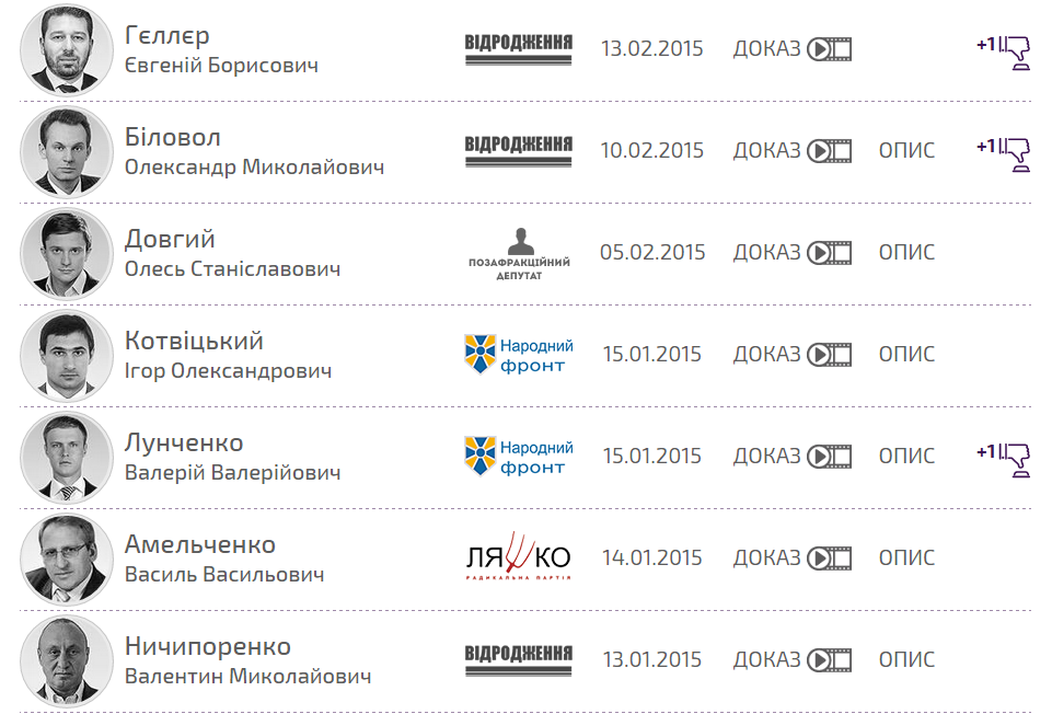 21 парламентарий представляют 6 политических сил: Воля народу, Народный фронт, Видродження, Блок Петра Порошенко, Радикальную партию и внефракционные силы.