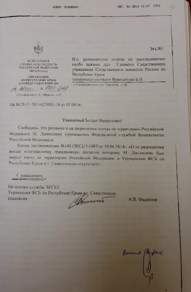 Адвокат Марк Фергин выяснил, кто подписал указание о запрете въезда в оккупированный Крым лидеру крымских татар Мустафе Джемилеву. На своей странице в Тwitter Фергин опубликовал соответствующий документ, подписанный и.о. Главного следственного управления Следственного комитета РФ на оккупированном полуострове.