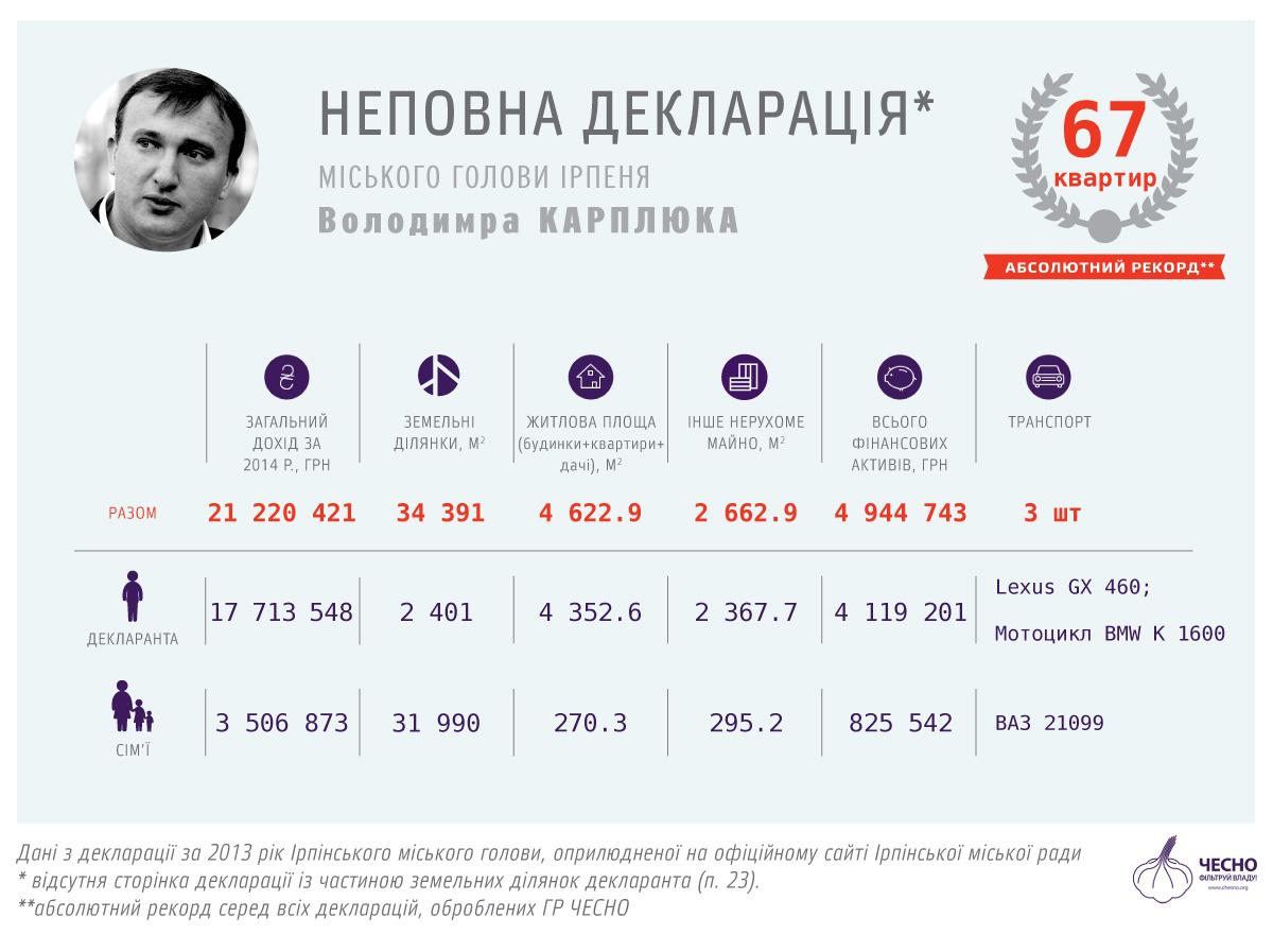 Чесно заявило, что в 2010 Карплюк баллотировался в мэры Ирпеня по поддержке скандального регионала - ректора Налоговой академии Петра Мельника, а сейчас возглавляет партию Новые лица.