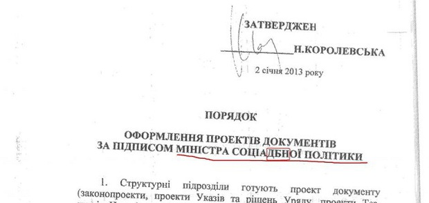 В распоряжении СМИ оказался документ Министерства социальной политики, которое недавно возглавила Наталья Королевская, где стоит подпись министра, несмотря на ошибки даже в названии ведомства.