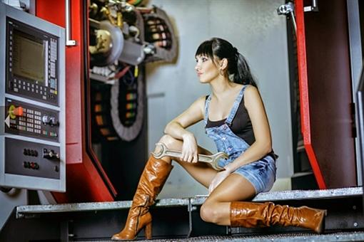 А пресс-секретарь городской парторганизации Партии регионов изображена в джинсовых шортах и с огромным гаечным ключом на фоне оборудования неизвестного назначения.