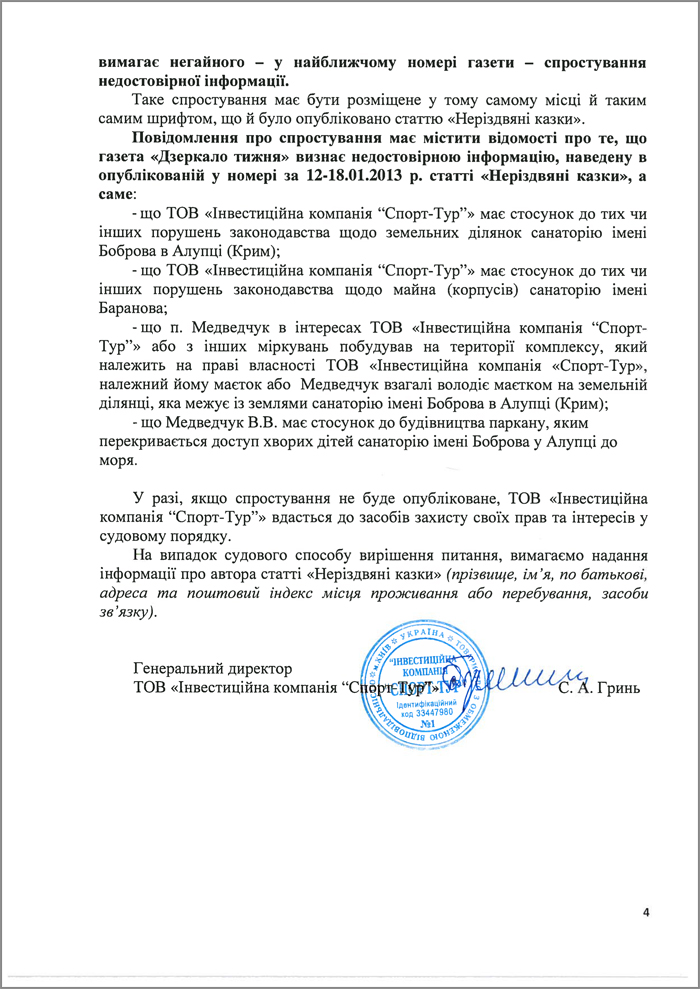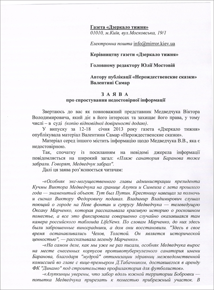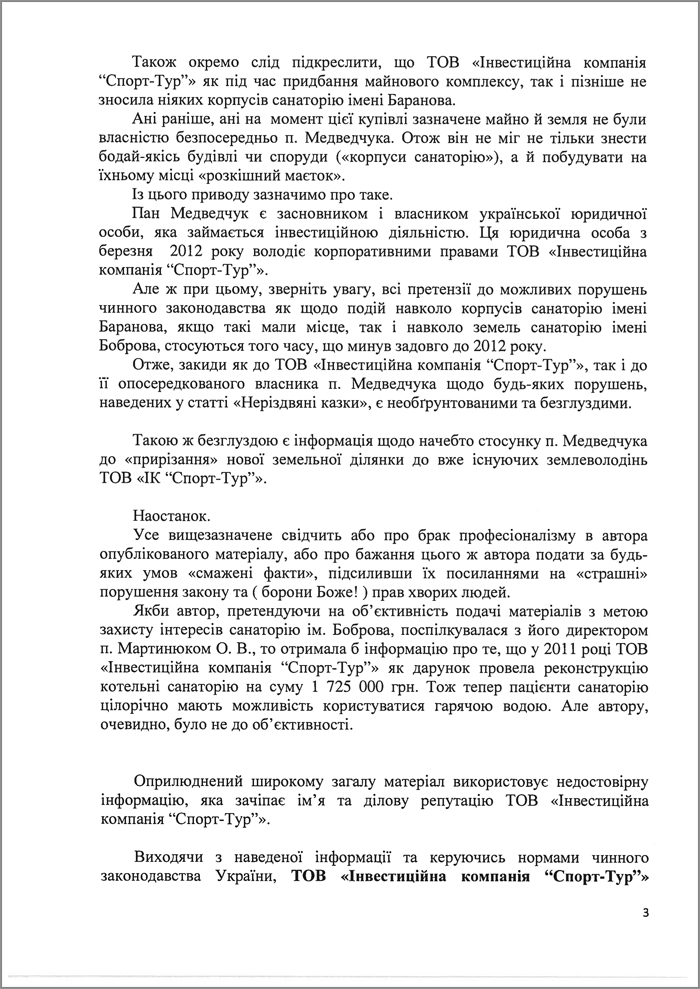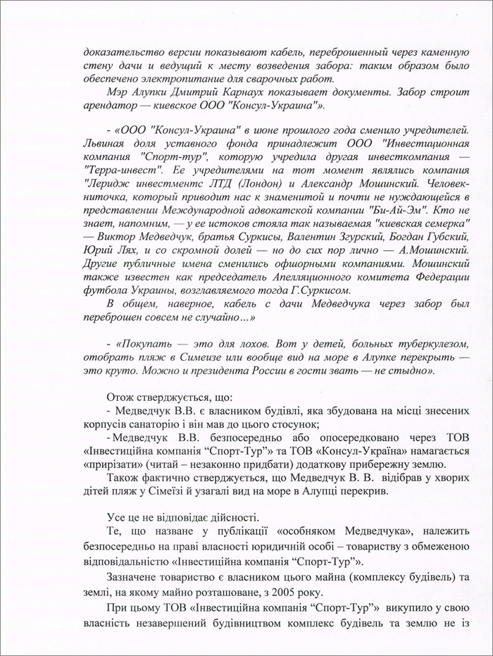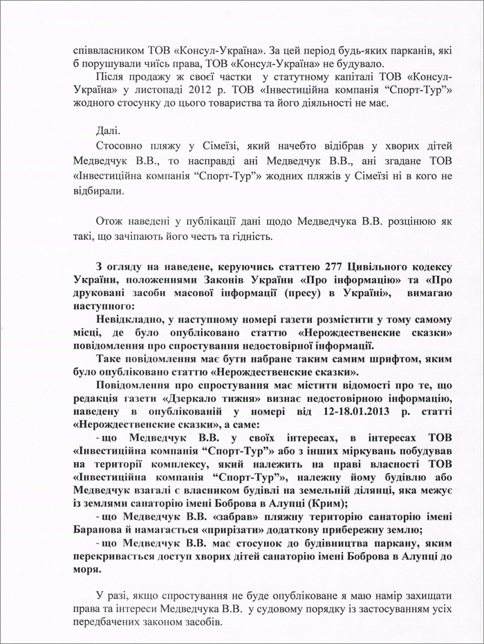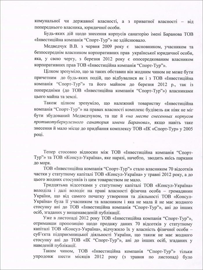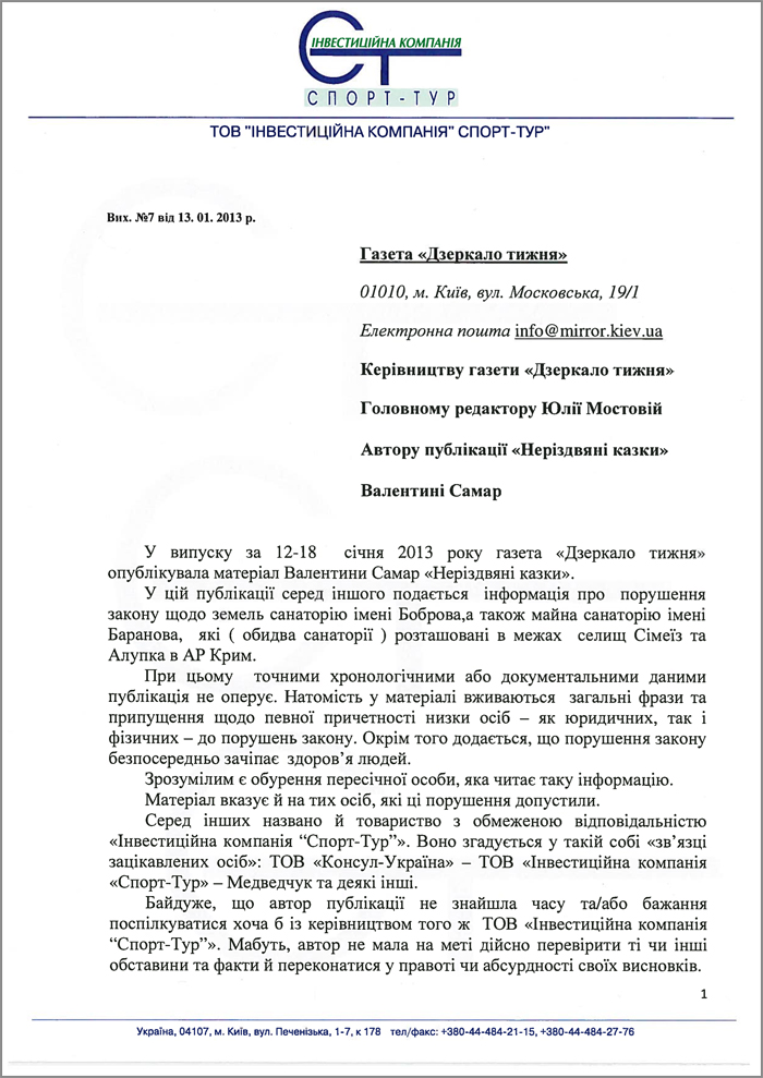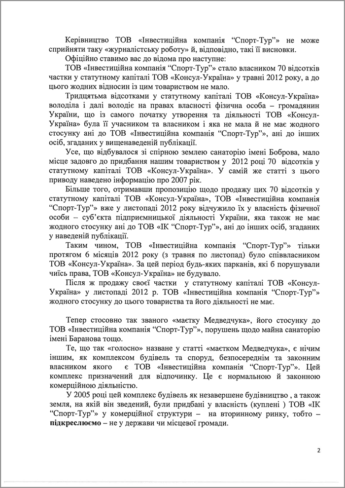 «В субботу, 12 января 2013 года газета «Зеркало Недели», сайт «Украинская правда», ряд других интернет-сайтов, разместили информацию, из которой следует, что связанная со мной ООО «Инвестиционная компания «Спорт-тур» каким-то образом ответственна за строительство забора, фактически изолирующего противотуберкулезный санаторий им. Боброва от моря, и высказали ряд других ложных измышлений.