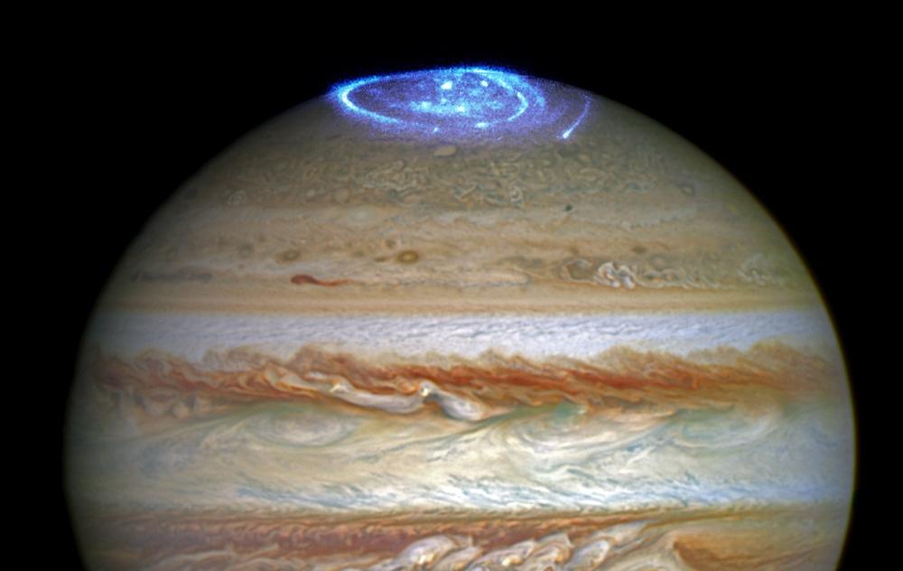 Затем в 1990-х годах телескоп «Хаббл» сделал более качественные снимки. Причина появления сияний долгое время не была точно установлена. В отличие от земных, которые возникают в периоды повышенной солнечной активности, полярные сияния Юпитера постоянны, хотя их интенсивность меняется изо дня в день. Кроме того, они в восемь раз ярче и в сотни раз энергичнее, чем полярные сияния на Земле. По мнению специалистов NASA, сияния на Юпитере возникают в результате столкновения заряженных частиц солнечного ветра с молекулами газов, которые передают им энергию.
