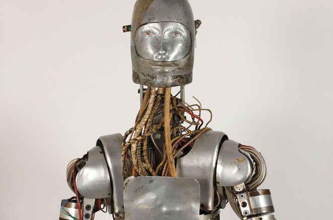 Внутренности робота покрыты алюминиевыми пластинами, а «лицо» снимается, чтобы обеспечить доступ к начинке головы.