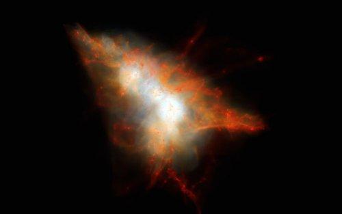 Фактически все излучение облака LAB-1 является излучением двух его огромных центральных галактик, которые находятся на этапе, предшествующем их полному разрушению. Вокруг них, словно стая пираний, кружится "рой" меньших галактик, собирающихся "попировать" останками своих больших собратьев. На основе новых данных группа Джима Гича составила сложную математическую модель, которая воспроизводит все, происходящее в облаке LAB-1, и в результате расчетов этой модели ученые получили излучение Лимана-альфа, которое почти в точности соответствует наблюдаемому в реальности. А его спектральные характеристики указывают на то, что это излучение является ультрафиолетовым светом, произведенным во время формирования новых звезд, который поглощается и переизлучается облаками холодного атомарного водорода.