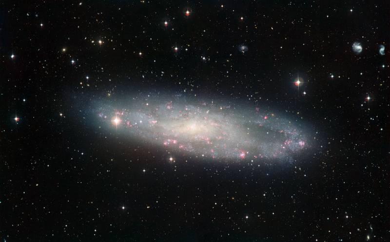 Астрономы отмечают, что галактика NGC 247 имеет необычную особенность, которую можно увидеть, рассматривая галактику целиком. Так на изображении, которое было выполнено телескопом Европейской южной обсерватории (ESO), справа, на диске галактики просматривается странная пустота, который охватывает почти треть общей длины галактики. Однозначного ответа на то, как образовалась этот «пробел» в звездах у ученых пока нет, однако некоторые исследования предполагают, что это связано, возможно, с гравитационным взаимодействием NGC 247 с другой галактикой.