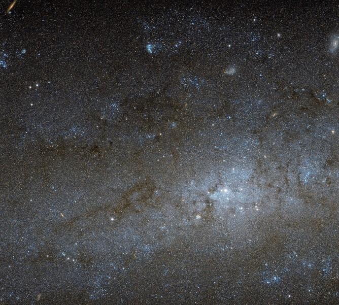 Новое изображение от космического телескопа «Хаббл» демонстрирует нам центральную область галактики, состоящей из «смеси» звезд, газа и пыли. Видно, что ядро галактики окружают темные нити пыли, которые контрастируют на фоне звезд, а газ образует яркие узлы, известных как области звездообразования HII, которые разбросаны по всему лику галактики, как во внутренних, так и во внешних областях.
