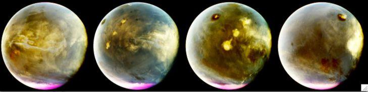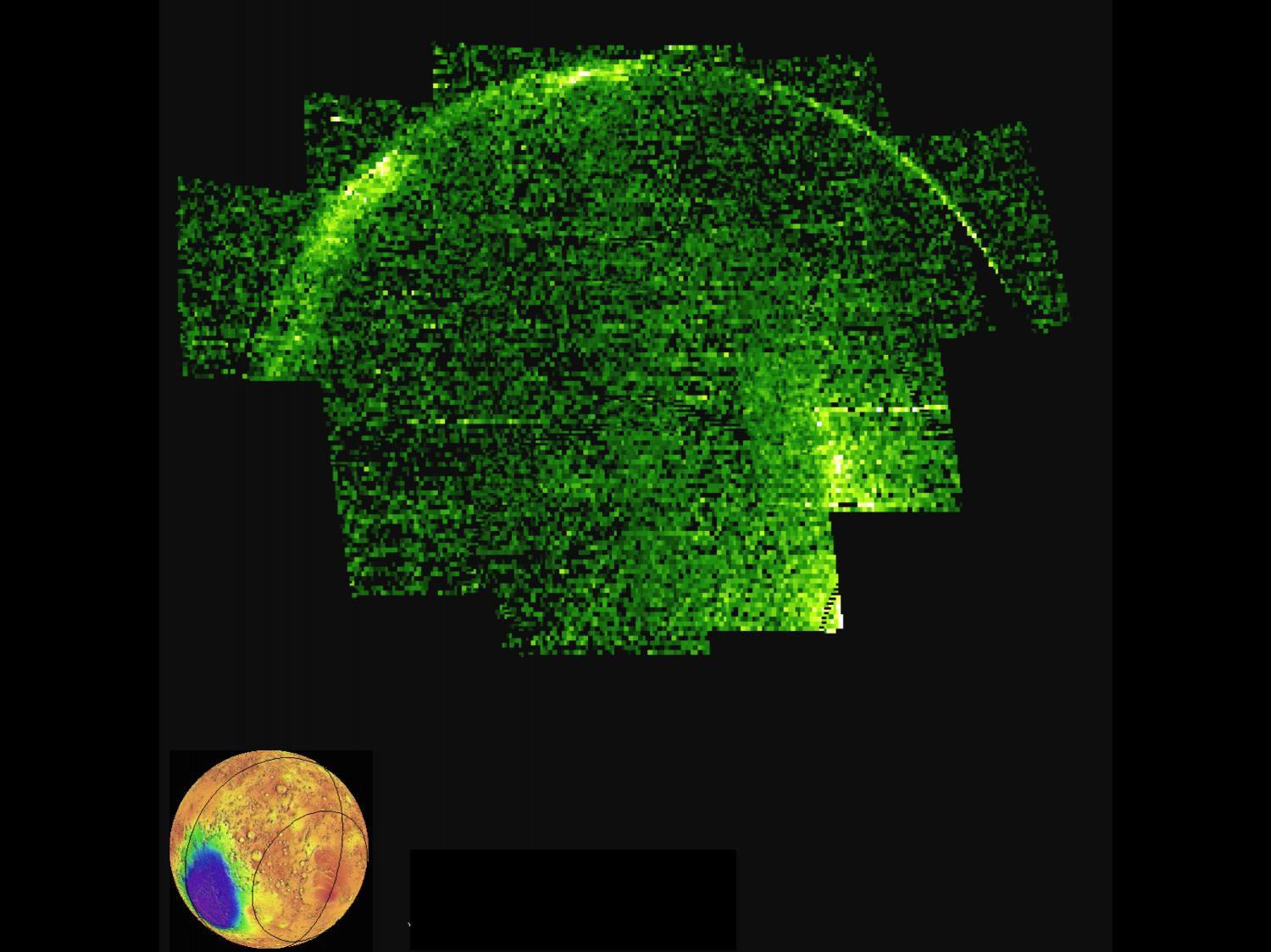 На представленном ниже снимке ночной стороны Марса в УФ диапазоне можно видеть «собственное свечение» марсианской атмосферы. Собственное свечение атмосферы наблюдается не только на Марсе, но и на других планетах, включая Землю, и оно связано с рекомбинацией в высоких слоях атмосферы планеты атомов азота и кислорода с образованием монооксида азота (NO), сопровождающейся испусканием фотонов ультрафиолетового излучения. Исходные атомы азота и кислорода образуются в результате расщепления молекул азота и диоксида углерода на дневной стороне планеты под действием солнечных лучей и переносятся ветрами, дующими в высоких слоях атмосферы, на ночную сторону планеты. Неоднородность наблюдаемого фона на снимке отражает картину циркуляции ветров высоко в атмосфере Марса.