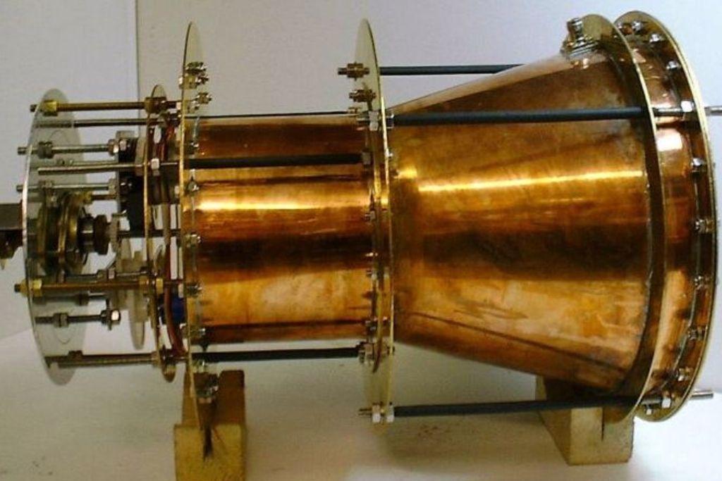 Двигатель EmDrive представляет собой устройство из магнетрона (генерирующего микроволны) и резонатора (накапливающего энергию их колебаний). Внешне агрегат напоминает положенное на бок ведро.