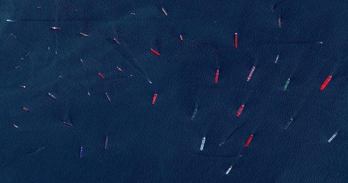 Грузовые суда и танкеры у входа в порт Сингапура