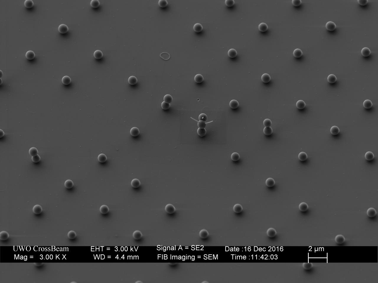 Ученые поставили друг на друга три «шарика» диоксида кремния размером 0,9 микрон и сфокусированным ионным пучком вырезали в верхнем глаза и рот. Руки и нос «снеговика» выполнены из платины.