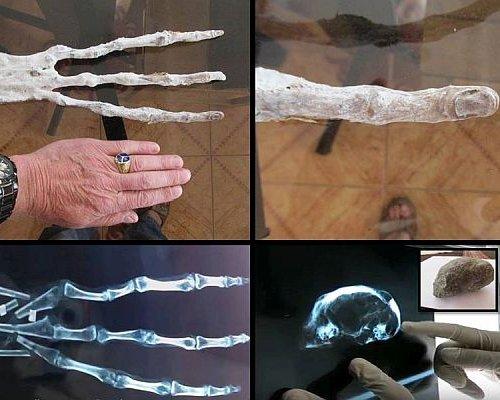 Рентген "руки" показал, что каждый из 3-х пальцев имеет 6 костей, в то время как человеческая рука имеет 3. Исследователи определили, что это явно не рука человека, но состоит из костей и кожи. Они были не в состоянии определить, что это на самом деле такое.