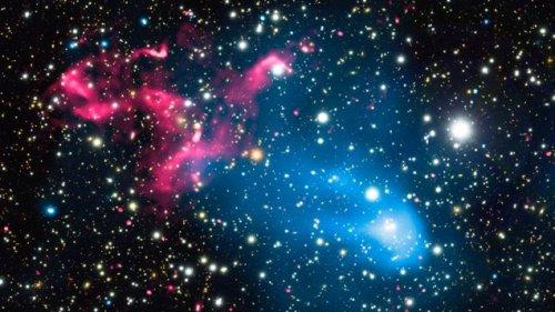 На приведенном выше изображении можно увидеть несколько процессов, приведших к образованию гигантского космического ускорителя. Синим цветом показано рентгеновское излучение сталкивающихся скоплений галактик, изображение которого было получено при помощи космической рентгеновской обсерватории Chandra. Эти скопления галактик удерживаются и притягиваются друг к другу гравитационными силами, в квадрильоны раз большими, нежели силы гравитации нашего Солнца.