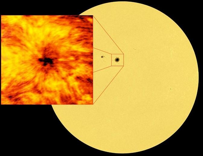 Первым предметом наблюдений ученых стало огромное солнечное пятно, которое изучалось в двух полосах приемников ALMA на волнах 1.25 и 3 миллиметра. На более коротких волнах ученые «видели» излучение от более глубоких слоев Солнца. Таким образом, изображение на волне 1.25 мм соответствует слою хромосферы, лежащему глубже и ближе к фотосфере, чем слой, изображение которого получено на длине волны 3 мм.