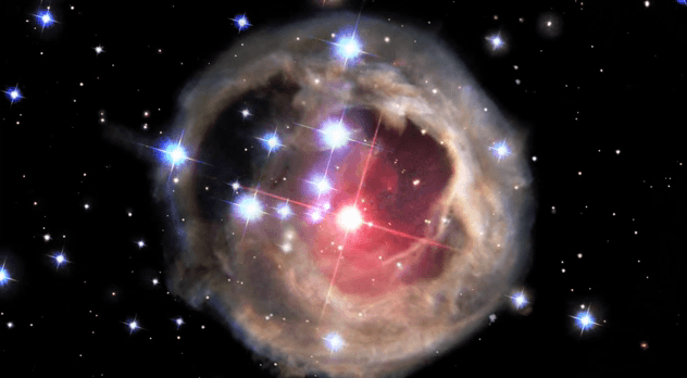 Звезда V838 сияла в созвездии Единорога до 2002 года, после чего внезапно очень быстро изменила свои размеры, увеличившись в диаметре в несколько раз, параллельно с этим свечение еще совсем молодой звезды превысило силу свечения нашего Солнца в 600 тысяч раз, после чего она взорвалась, высвободив огромное количество энергии.
