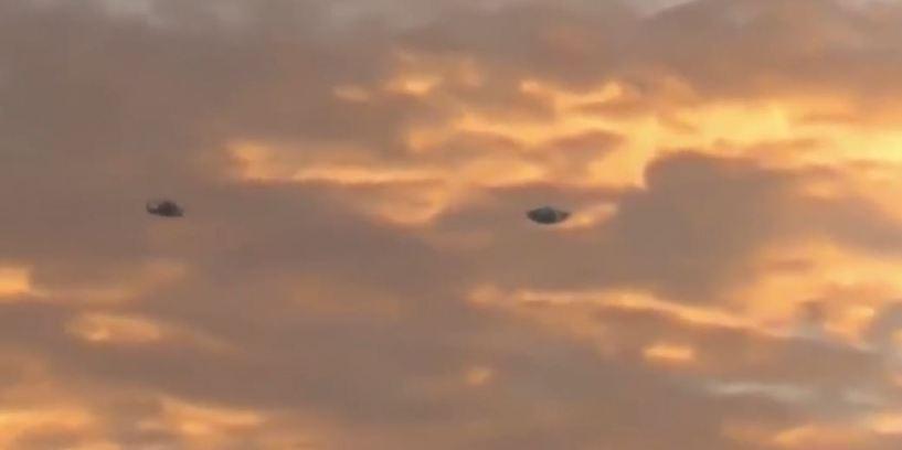 На видео можно хорошо рассмотреть, как в вечернем небе над городом завис неопознанный летающий объект, и отчетливо слышен звук вращающихся лопастей, а спустя мгновение, в кадре появляется и военный вертолет.