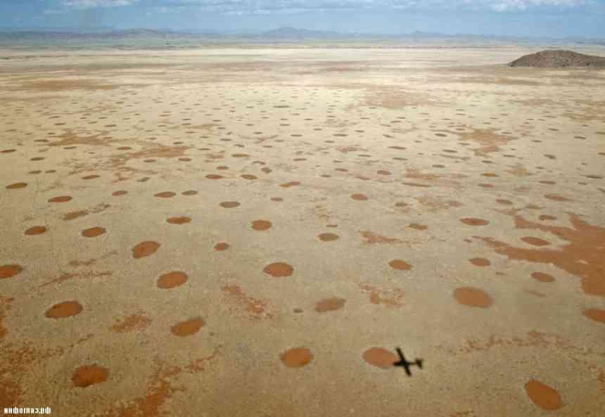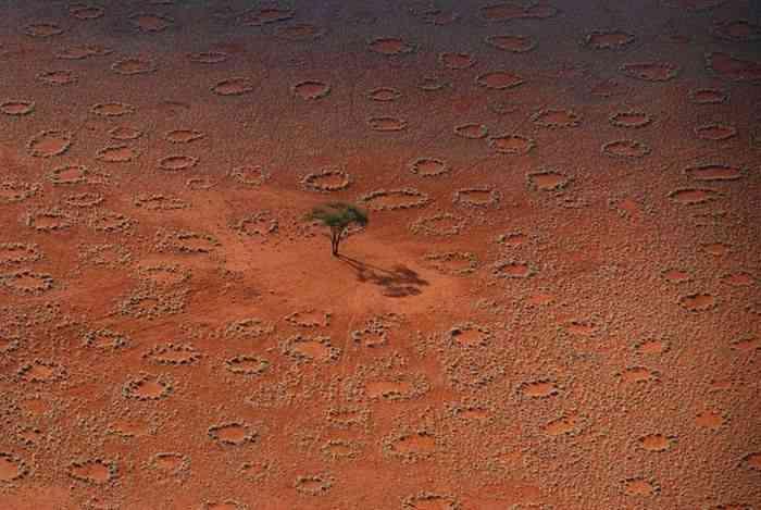 Эти обширные симметричные круги из сухой земли волнуют ученых долгие годы. Впервые были замечены в пустыне Намибии, но в последнее время появились такие и в Австралии. Круги достигают 34,7 метров и часто окружены растительностью. Самое интересное, что их не один и два. Можно найти миллионы подобных странных явлений. Ученые давно знали, что они образуются из термитов, которые грызут корни растений, или же от нехватки воды (или обе причины).