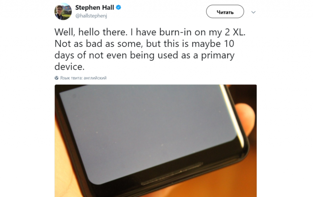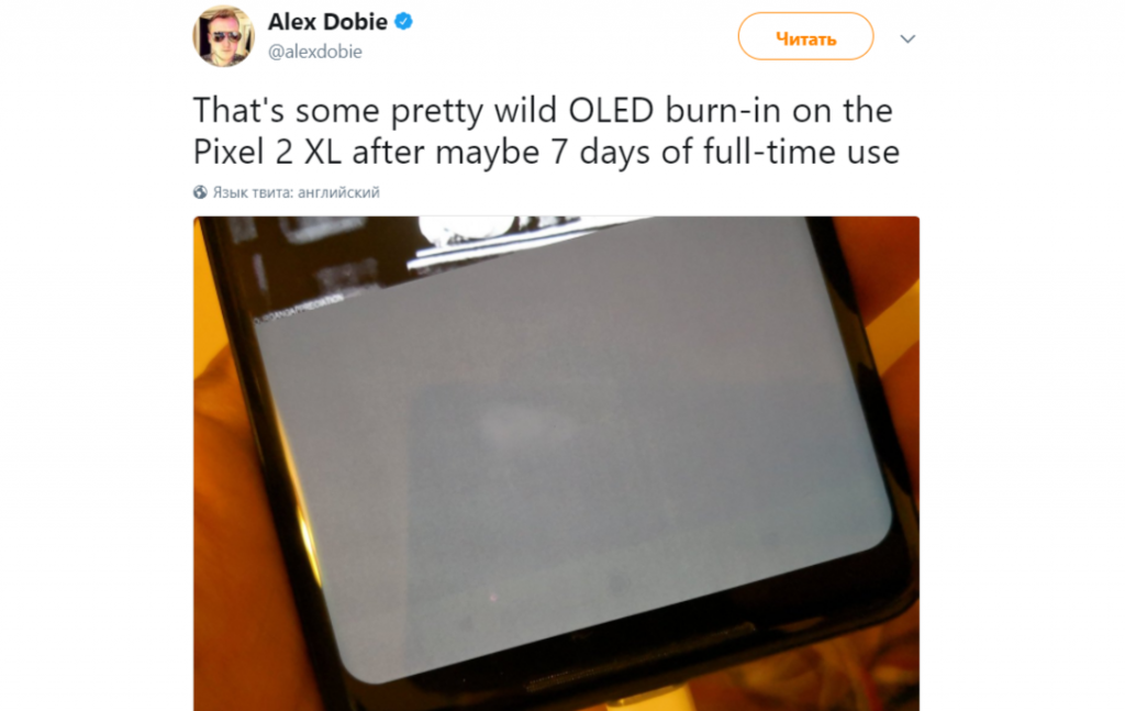 Первым о проблеме рассказал автор американского издания Android Central Алекс Доуби, опубликовавший в свой Twitter-аккаунт фотографию выгоревшего дисплея Pixel 2 XL. По словам журналиста, он использовал смартфон на протяжении одной недели и теперь, если открыть картинку серого цвета, то на дисплее видны кнопки навигации и даже иконки уведомлений.